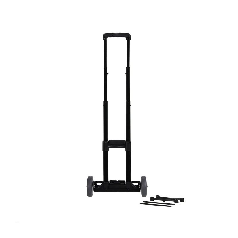 Three-stage extendable handle with locking button on handle. Tubes made of black aluminium, handle and mounting plates of plastic. The ball-bearing mounted wheels are fastened to a sturdy frame made of black powder-coated steel. The trolley is very easy to steer by the handle thanks to the large wheels and wide wheelbase. The handle clips into two included plastic brackets on the case.